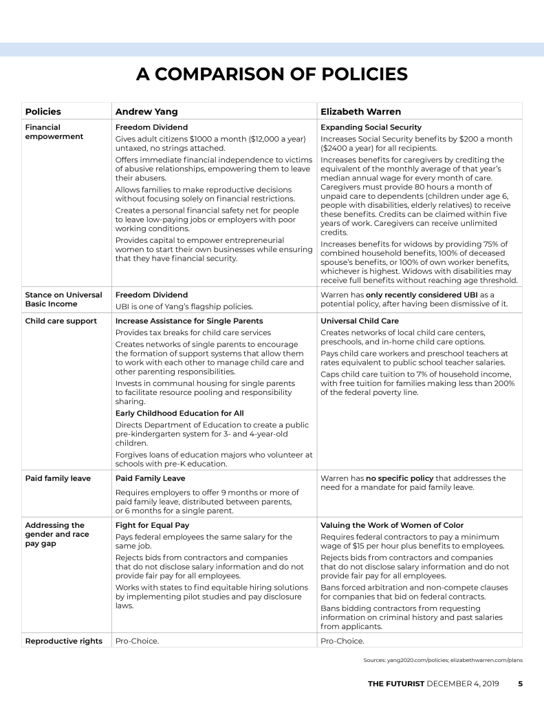 During the October debate, Andrew Yang pitted his plan for UBI against Warren’s Social Security plan. Yang offered to provide financial relief in the form of the $1000 Freedom Dividend as an immediate stimulus to all citizens over the age of 18, while Warren’s plan offered an extra $200 to Social Security for retirees.