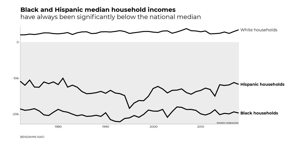 In 2016, non-Hispanic White households held a median value of $143,600 in assets. In contrast, Hispanic households held $21,420, and Black households held $12,920. According to a 2017 report from the Institute for Policy Studies, the median wealth of Black households is projected to drop to zero by 2053.